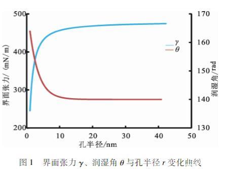 图1界面张力γ、润湿角θ与孔半径r变化曲线
