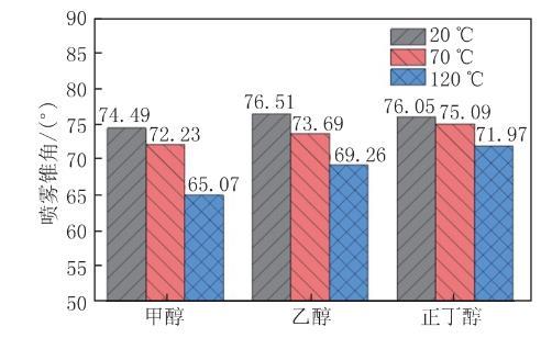 喷雾开始后1.0 ms时刻、环境温度为20℃时,3种醇类燃料的喷雾形态无明显差异,此时环境温度较低,均未到达各燃料的沸点,图像中的各路醇束较为清晰,无明显蒸发和互相干涉现象。环境温度升高至70℃,此时已超过甲醇的沸点,温度的升高使燃料的动力黏度和密度减小,表面张力下降,燃料中的分子运动速度加快,分子间距增大,分子之间的作用力减小,液滴更容易破碎,使醇雾更容易产生。温度到达120℃时,3种燃料在喷射过程中都产生了大量醇雾,各支醇束之间相互干涉、重叠,高温环境使喷雾液滴的轴向贯穿动量降低,各燃料的整体喷雾长度略有缩短。3种燃料中,甲醇燃料的喷雾形态所发生的改变十分明显,高温的环境使甲醇产生大量醇雾,同时喷雾向轴线收缩,锥角减小的幅度较大。与乙醇、正丁醇相比,甲醇具有更低沸点和较高挥发性,在喷射过程中液滴受环境空气加热,黏度和表面张力降低,很快发生破碎并转化为气态,形态的转变使液滴的动量减小,从而抑制了喷雾的扩散。