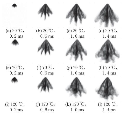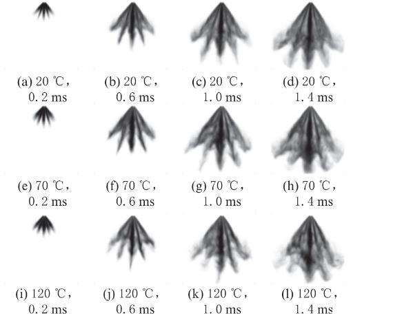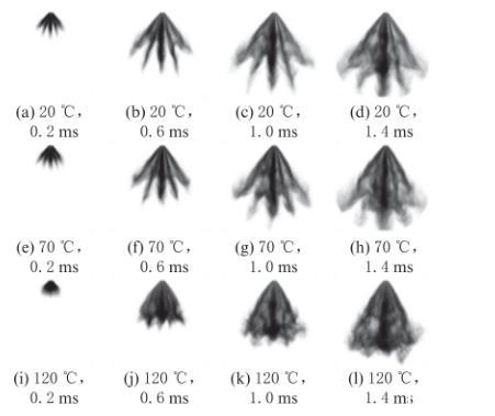 图4不同环境温度和喷雾开始后时刻下甲醇的喷雾形态