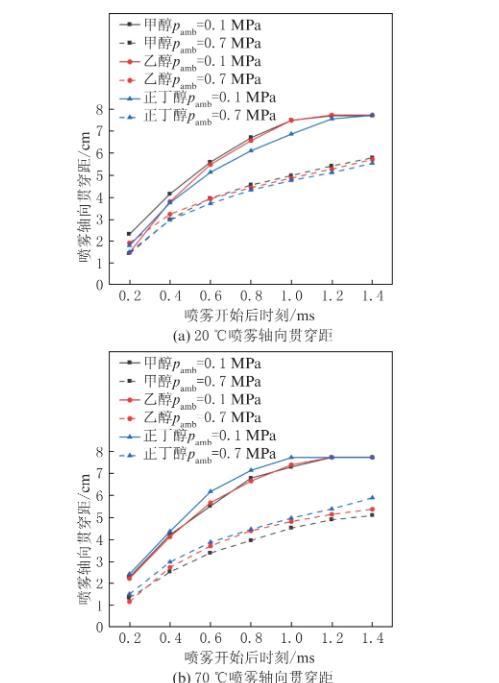 在试验中发现,高温高压的环境对喷雾形态产生了较大的改变,相比于单种工况,环境温度和背压共同对喷雾形态有着更复杂的影响。图8为3种醇类燃料在不同温度(20℃、70℃、120℃)、不同背压(0.1 MPa、0.7 MPa)的环境下,喷射压力为20 MPa时的喷雾轴向贯穿距的变化。