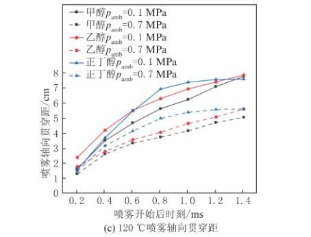 环境温度升高至70℃、120℃时,正如图8(b)和图8(c)呈现出的,正丁醇的喷雾轴向贯穿距高于甲醇和乙醇,这与常温常压的环境条件下完全相反。尽管正丁醇的潜热较低,但环境温度和压力的升高使甲醇和乙醇的过热度高于正丁醇,进而引发更高的显热,提升了甲醇和乙醇的蒸发率,导致醇束发展缓慢。