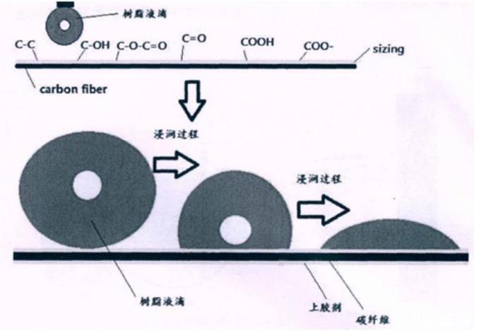 树脂对碳纤维表面的浸润性影响因素有很多。碳纤维表面的比表面积的大小,碳纤维表面的沟槽结构或纤维表面的活性基团的数量和种类,均对碳纤维的浸润性有影响。