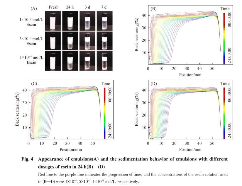 可见,七叶皂素浓度为1×10-4和5×10-4mol/L时,在24 h内分层较明显,前者的分层程度略大于后者,当浓度为1×10-3mol/L时,分层得到明显抑制,较为稳定,该现象与贮存稳定性表征结果一致[图4(A)].这是由于两亲性的七叶皂素分子结构具有较多的含氧基团(羟基和羧基),在油-水界面层具有强分子间作用(氢键),高浓度形成的界面膜的收缩弹性强于低浓度,在油-水界面发生形变时,界面膜产生相应形变而非解吸附,因此高浓度七叶皂素所形成的乳液稳定性相对更好.