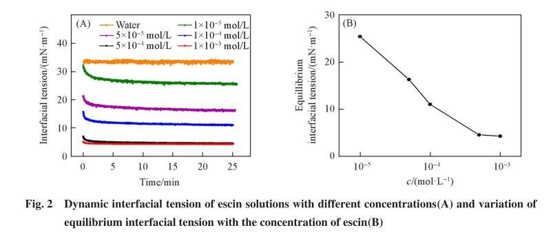 使用视频光学接触角测量仪,利用悬滴法测定溶剂油150#和不同浓度七叶皂素溶液的油-水界面张力.溶液为内相,溶剂油150#为外相.将七叶皂素溶液置于气密性良好的注射器(针管外径为1.65 mm)中,利用步进马达将溶液(8μL)注射到装有溶剂油150#的玻璃皿中,CCD摄像机同步记录测定过程的液滴状态(每次测定25 min),软件通过液滴形状分析计算出界面张力.分别测定超纯水以及不同浓度七叶皂素溶液与溶剂油150#的界面张力,每个样品重复测3次.