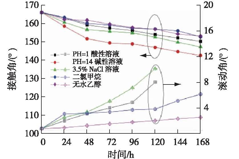 由图4可知,超疏涂层在无水乙醇和二氯甲烷中浸泡168 h后仍然保持超疏水性能;在pH=1的酸性溶液和质量分数3.5%的NaCl溶液中浸泡120 h后与水仍然保持超疏性能。但在pH=14的碱性溶液中浸泡48 h后接触角低于150°且已无法滚动。这说明涂层具有较好的耐酸、耐盐水和耐溶剂性能,但是耐碱性欠佳。