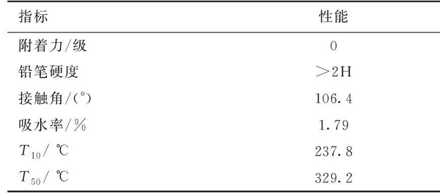 由表1可见,含氟聚氨酯固化膜和玻璃基材之间的附着力达到0级,铅笔硬度大于2H。FPU薄膜与水的静态接触角为106.4°,远高于不含氟的聚氨酯膜。本研究的FPU薄膜在浸泡24 h后吸水率趋于平衡,泡水200 h后吸水率不高于1.79%,远低于一般的聚氨酯的5%吸水率。归因于C—F链段具有很低的表面张力,会自发地向表面迁移并富集,降低了表面张力,提高了材料的憎水性。除此之外,从表1中还可知FPU的T10和T50分别为237.8和329.2℃。与一般聚氨酯材料相比,FPU的热稳定性没有很大程度的提升。