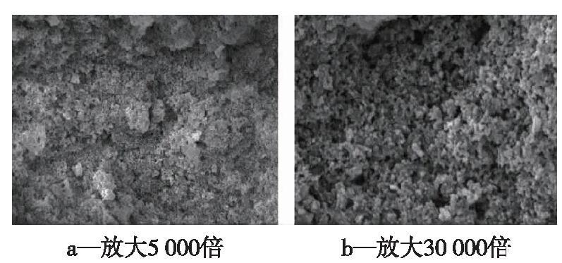 图2a中能够清楚地观察到表面有1~2μm的凸起和200~300 nm的孔隙。图2b是局部放大图,明显看出在涂层表面具有纳米级的凹凸结构,且涂层表面分布有大量不均匀的粗糙孔结构。许多小孔分布在这些凸起之间,小凸起与小孔共同形成珊瑚状结构,导致更多的空气被捕获到这些孔隙中。
