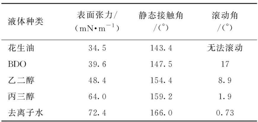 表2不同表面张力液体在超疏涂层上的接触角和滚动角
