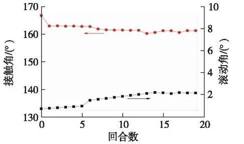 图5为超疏涂层在经过19次磨损的每次磨损周期后对水的接触角和滚动角变化情况。