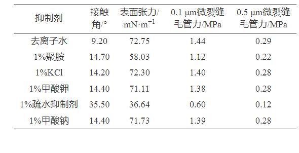 同时从表1中可以看出,疏水抑制剂能够有效降低溶液的表面张力,当微裂缝的宽度为0.1μm时,微裂缝对于去离子水的毛管自吸力达到1.44 MPa,而加入疏水抑制剂后可以降低至0.60 MPa,而且随着微裂缝宽度增加毛管自吸力逐渐降低。纳米级别的微裂缝具有较高毛管自吸力,所以在体系构建时应封隔页岩微纳米级裂缝和加入疏水类的处理剂,弱化微纳米级裂缝的毛管自吸力。