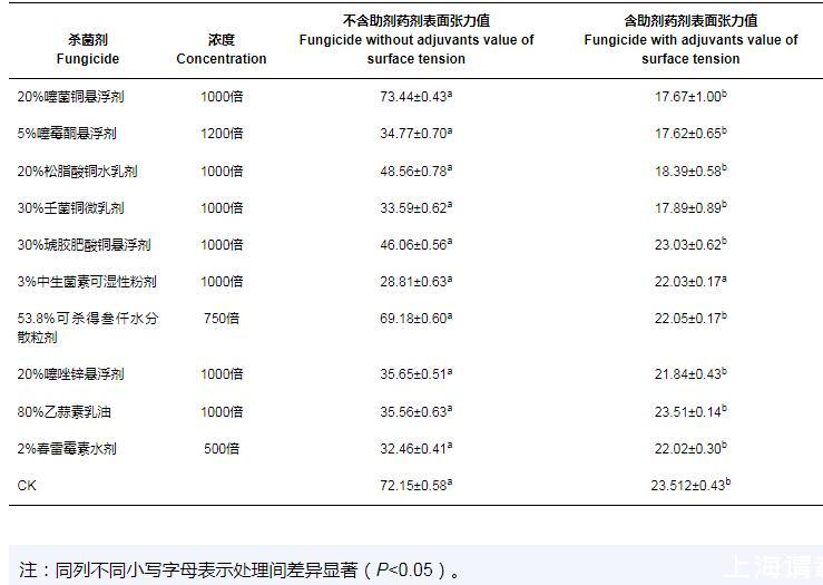 参照各供试杀菌剂田间推荐剂量,分别配置10 mL药液2组,其中一组添加助剂,一组不含助剂。通过蜜桃AV免费观看测试各药液的表面张力值。每组设置3个重复,以水作为空白对照。