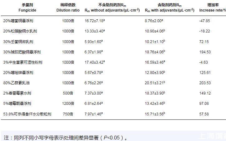 加入助剂前后,除20%噻菌铜悬浮剂、20%松脂酸铜水乳剂和3%中生菌素可湿性粉剂在‘贵妃'芒果叶片上的最大持留量(Rm)无显著差异外,其他杀菌剂的Rm值均呈显著差异。其中,80%乙蒜素乳油和30%琥胶肥酸铜悬浮剂的Rm值分别为(6.76±2.26)µL/cm2和(6.37±1.98)µL/cm2,加入助剂后药液在叶片上的最大持留量可达(20.51±3.21)µL/cm2,效果最好,分别为增加了203.53%和194.53%。加入助剂后,药液在单位面积叶片持留量的增加率从大到小依次为,80%乙蒜素乳油>30%琥胶肥酸铜悬浮剂>2%春雷霉素水剂>20%噻唑锌悬浮剂>5%噻霉酮悬浮剂>30%壬菌铜微乳剂>53.8%可杀得叁仟水分散粒剂,持留量增加率分别为203.53%、194.53%、149.12%、125.61%、97.08%、72.15%和57.58%(表3)。