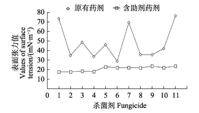 研究表明,在加入0.1 g/L助剂380前后,田间推荐剂量的20%噻菌铜悬浮剂、20%松脂酸铜水乳剂和20%松脂酸铜水乳剂等9种杀菌剂的表面张力值均降低,并且存在显著性差异。其中,1000倍的20%噻菌铜悬浮剂表面张力值为(73.44±0.43)mN/m,加入助剂后的表面张力值为(17.67±1.00)mN/m,降低率可达74.94%。3%中生菌素可湿性粉剂的表面张力值在加入助剂前后无显著性差异(图3,表2)。