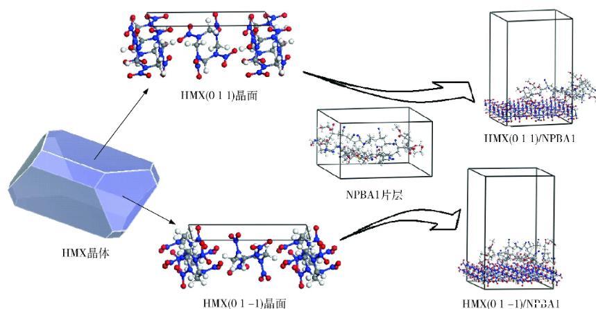 由于实际HMX以晶体的形式存在,因此在建立HMX吸附NPBA界面模型时,首先根据β-HMX的晶体衍射数据,构建HMX初始晶胞,模拟HMX的晶体形貌,确定HMX晶体的主要晶面后,扩建超晶面;然后,建立包含1条分子链的NPBA片层模型,将超晶面与片层模型复合,构建HMX吸附NPBA的6个界面模型,具体细节如2.1.1节中所述。3种NPBA的分子结构式及其模型见图1,HMX超晶面、NPBA片层模型及界面模型见图2,其余略。