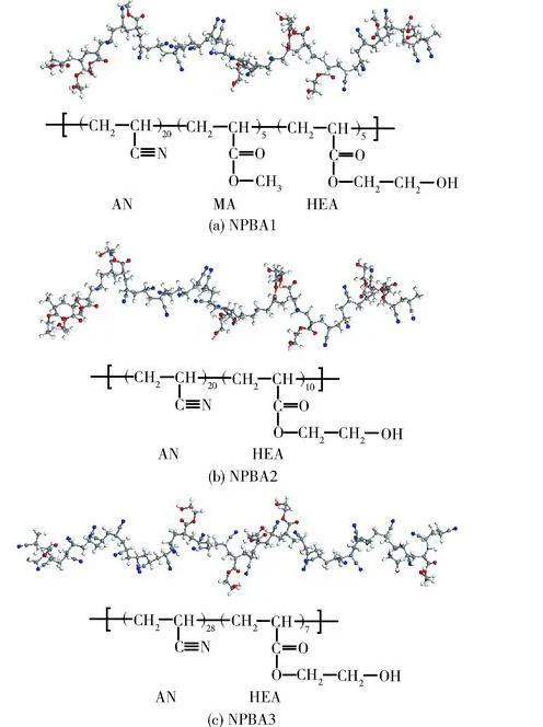 利用美国Accelrys公司Materials Studio软件建立NPBA分子模型时,NPBA1聚合单元AN、MA和HEA的数目分别为20、5和5,NPBA2聚合单元AN和HEA的数目分别为20和10,NPBA3聚合单元AN和HEA的数目分别为28和7,NPBA分子模型上各类聚合单元均为随机分布。此时3种NPBA分子模型的摩尔链节比分别为4∶1∶1、2∶1和4∶1,且相对分子质量均为2 300左右,使得所构建的模型与实际物质具有较好的对应关系。
