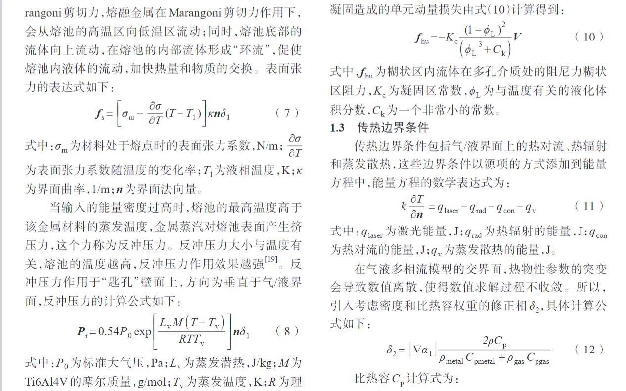 当输入的能量密度过高时,熔池的最高温度高于该金属材料的蒸发温度,金属蒸汽对熔池表面产生挤压力,这个力称为反冲压力。反冲压力大小与温度有关,熔池的温度越高,反冲压力作用效果越强。反冲压力作用于“匙孔”壁面上,方向为垂直于气/液界面,反冲压力的计算公式如下: