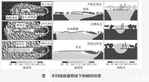 为分析线能量密度对球化缺陷形成机理的影响,选取激光功率150 W,线能量密度分别为83.3 J/m、125.0 J/m和250.0 J/m的3组参数进行数值模拟,结果如图2所示。当线能量密度为83.3 J/m时,部分熔融金属凝固并与周围粉末黏附成球;部分熔融金属在表面张力的驱使下倾向于减少表面能,迅速地成球;这两种成球方式往往共同出现。这是因为激光的穿透深度没有到达基板,此时接触角为180°,呈现不完全湿润状态,液态金属流动受阻,因此不能在基板上铺展。当线能量密度提高到125.0 J/m时,单道由球化形态向断续态过渡,虽然表面还比较粗糙,但是球化效应明显减弱,此时激光穿透深度刚刚到达基板,接触角约为90°。当线能量密度继续提高到250.0 J/m时,熔化的金属粉末形成充足的熔融金属,从而改善其流动性,凝固后获得高度均匀和连续的单道,激光穿透深度能够穿透粉末床并熔化基板,并且接触角大于90°。因此,球化缺陷的形成机理可以总结为能量密度太低,熔融金属不能在基板上铺展。判断是否球化最直接的依据是观察熔池深度是否穿透粉末层厚,并熔化了基板,也可以计算熔池的接触角是否小于90°来判断熔池的湿润性。此外,还可通过适当提高线能量密度,提高熔融金属的流动性,以获得更均匀和连续的单道。
