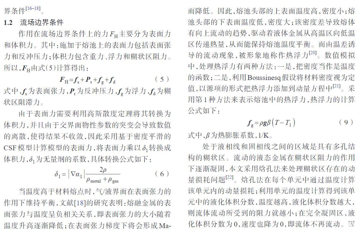 作用在流场边界条件上的力FH主要分为表面力和体积力。其中:施加于熔池上的表面力包括表面张力和反冲压力;体积力包含重力、浮力和糊状区阻力。所以,FH由式(5)计算得出: