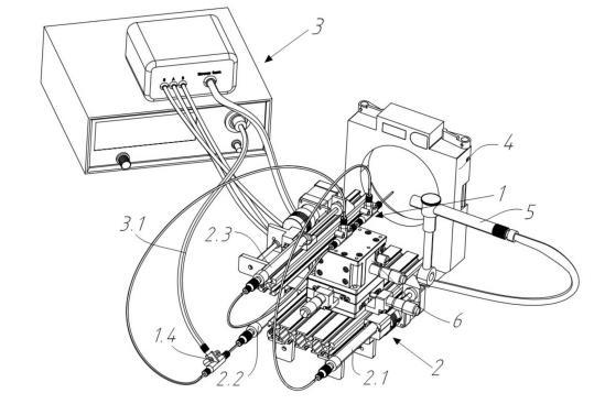 1、双鞘液管路模块;1.1、外鞘液不锈钢管;1.2、内鞘液石英毛细管;1.3、样品石英毛细管;1.4、三通;1.41、第一T型三通;1.42、第二T型三通;1.5、外鞘液;1.6、内鞘液;1.7、样品液;1.8、液锥喷雾;2、集成化微流量泵控模块;2.1、集成化微流量泵控模块一;2.11、步进电机;2.12、丝杆;2.13、联轴器;2.14、鲁尔接头玻璃注射器;2.15、圆接头;2.2、集成化微流量泵控模块二;2.3、集成化微流量泵控模块三;3、高压电势加载模块;3.1、高压输出导线;4、质谱接口连接模块;5、数码显微镜组件;6、空间位置微调组件;6.1、三轴台;6.2、M3螺丝;6.3、T型螺母。