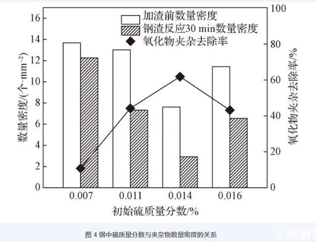 在钢液中,氧、硫是最常见的表面活性元素。当这些元素在熔融钢液中的质量分数增加时,钢-渣的界面张力和夹杂物与钢液之间的界面张力会迅速减小。钢渣反应前期,由于钢中初始氧、硫含量高,活度也高,夹杂物与钢液的界面张力较低,随着脱硫、脱氧反应的进行,界面张力增大。因此在30 min的钢渣反应过程中,界面张力、接触角等一直在动态变化。本试验将钢液初始氧、硫质量分数调整到一定值后,随着钢渣反应发生和脱氧产物在钢液中运动上浮,钢中硫含量、溶解氧含量是变化的,因此选取相同时间段的2个固定时刻,即同批铸坯溶清钢液在增氧/硫10 min和钢渣反应30 min,可以对比整个反应过程不同初始氧、硫元素对重轨钢中氧化物夹杂去除的影响。