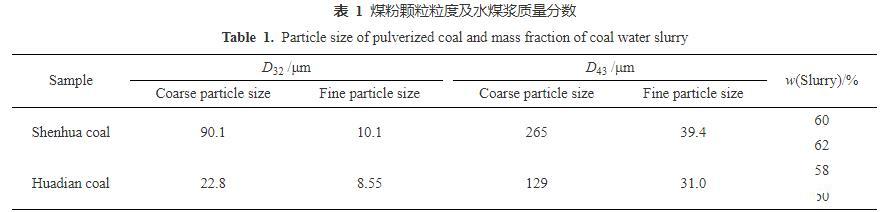 首先将破碎好的煤样在105℃和通风条件下烘干2 h,然后放入磨机研磨30 min,最后在振筛机上进行筛分,得到粗、细两种粒级煤粉,分别称作粗颗粒和细颗粒。采用Mastersizer 2000激光粒度仪测试了煤粉的粗、细颗粒粒度,分别如表1和图1所示。制备的粗、细两种煤粉颗粒存在着一定的粒度分布,因此选取平均直径来表示其粒度特性。在燃烧、气化和喷嘴雾化等应用中,常选取索特平均直径(D32)或德布鲁克平均直径(D43)作为平均直径。采用干法制浆,配制时粗、细煤颗粒的质量比为6∶4,分别称取一定质量的烘干后的煤粉和去离子水以及分散剂(煤粉质量的1%),并用搅拌器在1000 r/min的转速条件下搅拌15 min进行制浆。不同浓度的水煤浆会呈现出不同的黏度和表面张力等特性,这些参数会对水煤浆微观破裂产生显著影响,所以本文选择了实际气化生产中常见的质量分数为58%~62%的水煤浆为研究对象。
