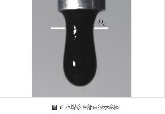 与纯液体不同,由于浆体液固混合物流变性和屈服应力等参数的影响,浆体破裂过程更加复杂。在浆体破裂末期,当水煤浆液桥的喉部直径(Dm,如图6所示)尺寸很小时,固体颗粒将会发挥显著影响。典型水煤浆破裂实验照片如图7所示,由于微观破裂条件下液固出现部分分离,煤粉颗粒在液桥喉部附近凸出气液界面,使得原本光滑的水煤浆表面逐渐粗糙,其变化特性与水煤浆黏度、表面张力和屈服应力等参数密切相关。