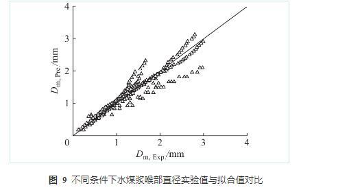 图9不同条件下水煤浆喉部直径实验值与拟合值对比