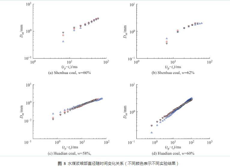 图8水煤浆喉部直径随时间变化关系(不同颜色表示不同实验结果)