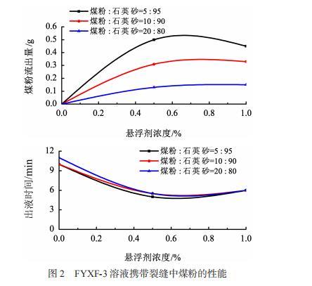 图2为FYXF-3的浓度分别与出液时间、煤粉流出量的关系图;图3为煤粉:石英砂比例为5:95时的实验现象图。