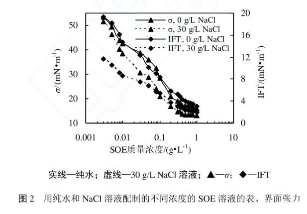 图2用纯水和NaCl溶液配制的不同浓度的SOE溶液的表、界面张力