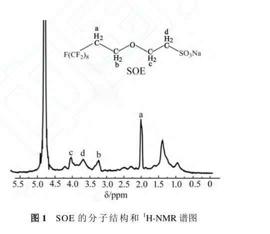 SOE的分子结构和1H-NMR(D2O,400 MHz)谱图如图1所示。图中SOE分子中所有氢的化学位移δ(ppm)如下:δa=2.02和δb=3.25分别为—CH2CH2O—中氢的化学位移,δc=4.03和δd=3.68分别为与磺酸离子直接相连的—CH2CH2—中氢的化学位移。溶剂(D2O)中残余氢的δ为4.79。1H-NMR的表征结果说明样品为目标产物。