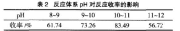 缩合反应需在碱性条件下进行,碱性太弱,不利于反应进行,但碱性太强又会加速酰氯水解,使产品不纯,因此必须严格控制反应体系的pH。还有一个原因就是当氨基酸的羧基变成钠盐后,羧基的化学反应性能即被掩蔽或者说羧基被保护,而氨基的化学反应性能得到加强或说氨基活化,容易和酰基结合。因此体系的pH选取在8~12。在n(天冬氨酸)∶n(十四酰氯)=1.1∶1.0、反应时间3.5h、反应温度5℃的条件下,考察不同反应体系pH对反应的影响,其结果如表2所示。由表2可知,体系在pH为10~11时收率最高。故选择pH为10~11。