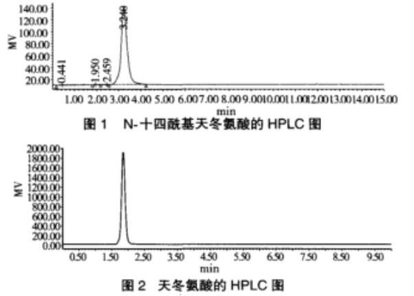 反应之后,体系为浅黄色透明均一溶液,减压蒸馏回收有机溶剂丙酮,然后用1.2mol·L-1盐酸调节体系pH值为5~6,可看到有白色物质析出,用石油醚萃取,可看到上层变浑浊,而下层为澄清浅黄色透明溶液。取出下层萃取液,继续调酸至pH值为1~2,可观察到在调酸过程中,刚开始滴加时溶液不变浑浊,说明棕榈酸已大部分在pH值为5~6之前析出,而产物在这个pH值下并不会析出,随着pH值的降低,又有白色物质析出,应为N-十四酰基天冬氨酸,过滤真空干燥可得N-十四酰基天冬氨酸。用0.5mol·L-1氢氧化钠/乙醇溶液中和至pH=7,冷却析出物烘干,即为N-十四酰基天冬氨酸钠盐产品。用高效液相色谱仪测得产品的纯度为97.06%。