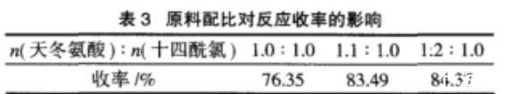采用天冬氨酸稍过量,一方面可以抑制酰氯的水解,另一方面又有利于提纯。选取n(天冬氨酸)∶n(十四酰氯)=1.0~1.2∶1.0。在反应体系pH=10~11、反应时间3.5h、反应温度5℃条件下,考察不同原料配比对反应的影响,结果如表3所示。