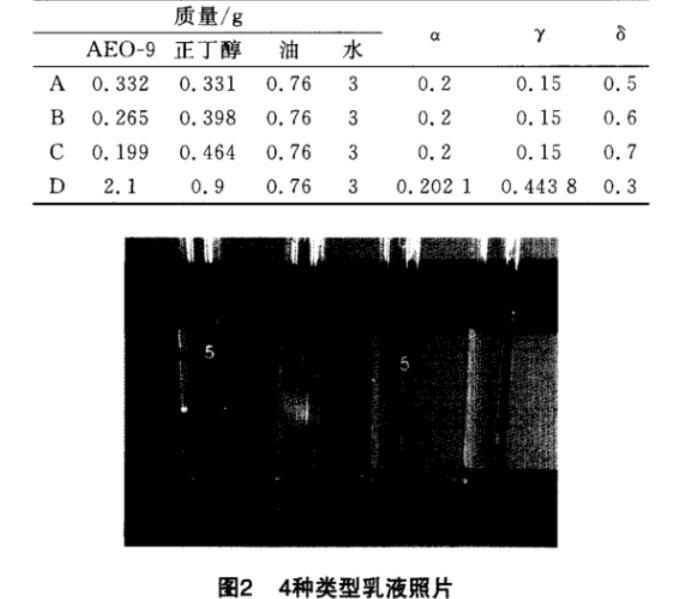由图1可见,在所配制的乳液中,既有均相乳液,也有两相(上相、下相)乳液,同时有三相(中相)乳液。在选择典型体系时,应体现出全面性,即以上4种类型乳液都涉及到,同时应考虑到渐变性,即固定某个变量(此处固定γ),一种相态向另一种相态转变。由此,选出其中4组:A(下相乳液)、B(中相乳液)、C(上相乳液)、D(均相乳液),A、B、C、D的组成如表1所示,形成的乳液照片如图2所示。分别将乳液部分分离出来,稀释成质量分数为0.1%、0.3%、0.5%、1.0%的微乳液。