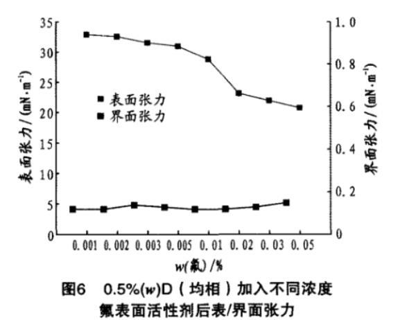 0.5%(w)D(均相)加入不同浓度氟表面活性剂后表/界面张力见图6。