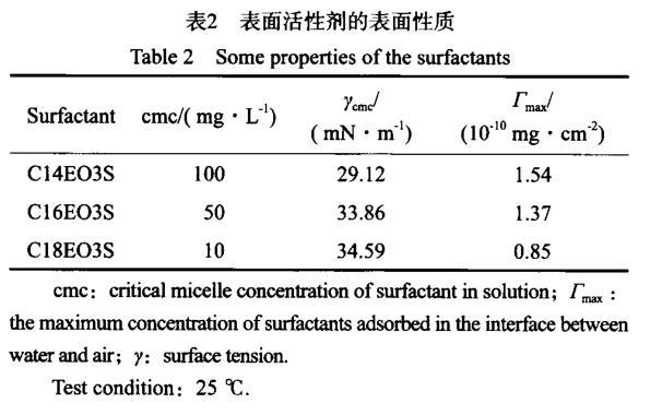 表面活性剂分子的结构特点决定了其在水溶液界面(液-气)上的吸附特性,其极性基团指向水、非极性基团则指向气。应用Gibbs公式可计算表面活性剂在单位溶液表面的最大饱和吸附量(Γmax),表面活性剂的表面性质见表2。由表2可见,C14EO3S,C16EO3S,C18EO3S表面活性剂在蒸馏水中的cmc分别为100,50,10 mg/L,对应的γcmc分别为29.12,33.86,34.59 mN/m。由此可见,表面活性剂在蒸馏水中的cmc随疏水基链长的增加而降低。这是因为:一方面,脂肪醇聚氧乙烯醚磺酸盐表面活性剂中含有亲水的EO基团,其分子链呈锯齿蜷曲形态排列,分子占据面积较大;另一方面,分子中的疏水基链长的增加,导致疏水基团的相互作用增强,对蜷曲的分子起到拉伸作用,同时会降低分子亲水头基面积,在这两个相反作用中疏水基的相互吸引作用随着疏水链长度的增加而明显增强,使得表面活性剂分子排列更紧密,易于形成胶束。但cmc对应的γcmc则随疏水基链长的增加而略有增加。