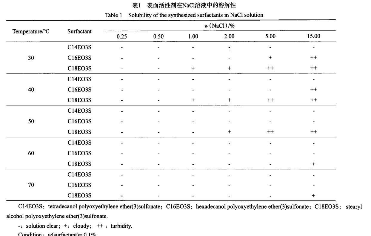 表面活性剂在NaCl溶液中的溶解性见表1。从表1可看出,在实验温度(30~70℃)内,C14EO3S在不同NaCl含量的溶液中均具有较好的溶解性;C16EO3S在30℃的5.00%(w)NaCl溶液中出现浑浊现象,但随温度的升高,溶解性增强;C18EO3S的溶解性较差,当温度为30~40℃时,它在1.00%(w)的NaCl溶液中即开始出现浑浊现象,溶解性随温度的升高而逐渐增大,当温度升至60℃后仅在15.00%(w)的NaCl溶液中出现浑浊现象。实验结果表明,脂肪醇聚氧乙烯醚(3)磺酸盐表面活性剂中的脂肪醇碳原子数越少(碳原子数小于16),在盐溶液中的溶解性越好。