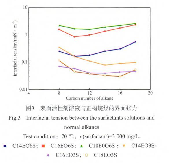 用模拟临盘油田地层水将脂肪醇聚氧乙烯醚磺酸盐配制成质量浓度为3 000 mg/L的溶液,在70℃下测得C14EO3S,C16EO3S,C18EO3S表面活性剂与原油间的界面张力分别为0.076,0.041,0.034 mN/m。表面活性剂溶液与正构烷烃的界面张力见图3。