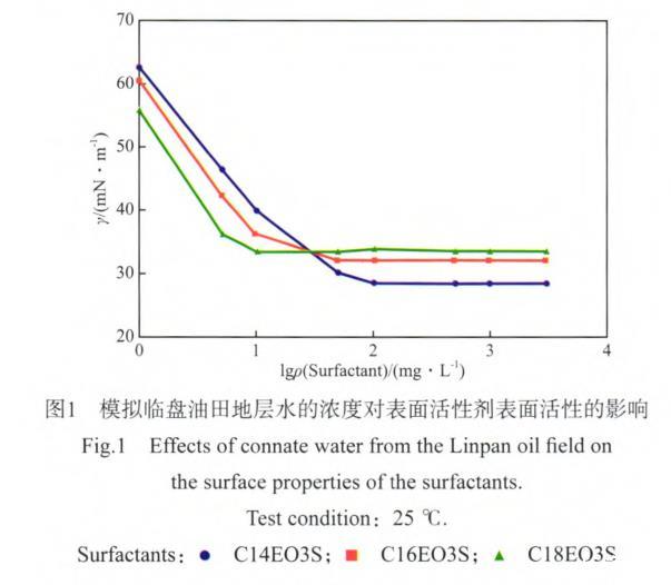 2)C14EO3S,C16EO3S,C18EO3S在蒸馏水中的cmc值分别为100,50,10 mg/L,其所对应的γcmc分别为29.12,33.86,34.59 mN/m;在模拟临盘油田地层水中的cmc值依次为80,40,10 mg/L,其所对应的γcmc分别为28.86,32.38,33.75 mN/m。当疏水基链长相同时,随EO数的增加,脂肪醇聚氧乙烯醚磺酸盐表面活性剂的cmc和其所对应的γcmc均呈增大趋势。