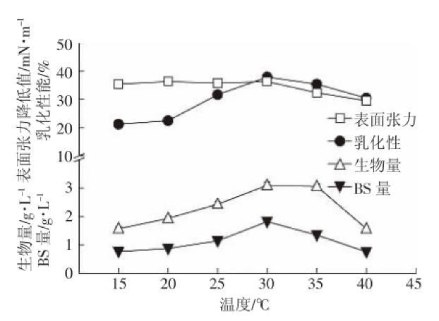 图4温度对147细菌生长以及生物表面活性剂产量的影响