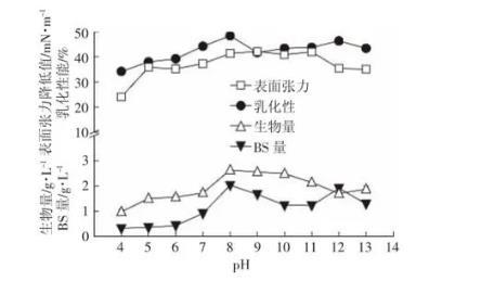 图5 pH对147细菌生长以及生物表面活性剂产量的影响