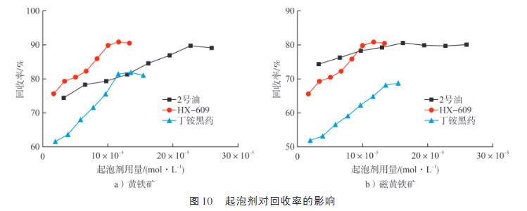 由图10可知:在起泡剂用量相同条件下,HX-609在提升黄铁矿回收率方面的效果显著优于另外两种起泡剂。对于磁黄铁矿而言,2号油与HX-609的浮选效果相当。然而,从药剂成本角度考量,2号油更具有优势。
