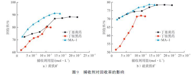 由图9可知:黄铁矿与磁黄铁矿的回收率整体均随着捕收剂用量的增加而逐渐提升;当回收率达到峰值后,继续增加捕收剂用量,回收率趋于稳定状态。相较于丁铵黑药和丁基黄药,MA-1作为黄铁矿的捕收剂性能更佳。在磁黄铁矿的浮选过程中,使用丁基黄药和MA-1作为捕收剂时,回收率差异不显著。鉴于实际生产过程中简化药剂制度和降低药剂成本的考量,丁基黄药更适宜作为磁黄铁矿捕收剂。