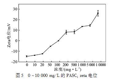 PASC1的絮凝效果见图3、图4.PASC1浓度为10——50mg/L时,透过率接近100%,继续增加PASC1的浓度,体系重新变得浑浊。随着PASC1浓度的进一步增加,体系的透过率降低,粘土颗粒悬浮体系重新稳定。粘土颗粒的表面由于同构取代而带负电荷,这意味着需要阳离子达到电荷平衡。对于钠基膨润土(Na——BT),Na+离子被吸引到层空间中。当Na——BT与水接触时,水可进入晶层内部,使可交换阳离子解离,在晶层表面建立扩散双电层,从而产生负电性。
