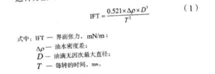 采用芬兰Kibron dIFT双通道动态界面张力仪进行界面张力测定。此张力仪的原理是:液滴通过旋转处于一定的离心场中,这时两种液体之间的界面张力及旋转的速度就决定了液滴的形状,液滴的平衡形状通过调整转速得到改变,而使液滴以一定的角速度自转,这时通过离心力、重力以及界面张力的三种力量的共同作用下,在高密度的液体中,低密度的液滴能够形成圆柱形或长椭球形液滴。这种方法可以测定出10-6mN/m的超低界面张力。