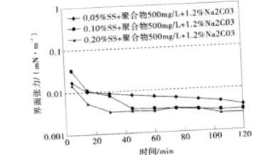 图1石油磺酸盐+聚合物500 mg/L+1.2%Na2CO3复配体系的动态界面张力(mN/m)