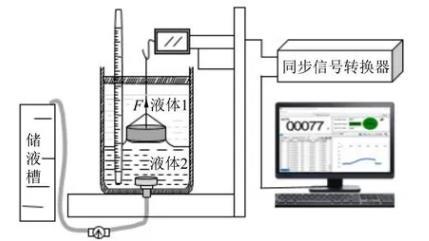 图1为自制2种液体间界面张力的动态实时测量装置图,该仪器主要包括电脑显示器、同步信号转换器、自制实验架台、力敏传感器、金属吊环、恒温杯、温度计、排液孔、排液管、流速调节器和储液槽等组成.