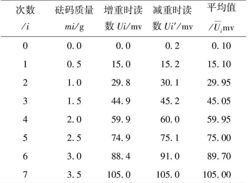 对于力敏传感器灵敏度的测量,保持不增加实验成本的原则,采用多次测量,先依次增加片码个数,再依次减少片码个数的方法平均人为误差,然后用逐差法求得力敏传感器的灵敏度,具体测量数据如表1所示。