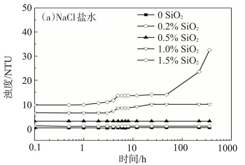 利用沉降法和浊度法分析分别用NaCl盐水、模拟地层水配制的不同纳米SiO2含量的纳米SiO2/SDS体系的稳定性,浊度法测试结果如图1所示。用NaCl盐水配制的SiO2/SDS体系在静置15 d时,仅纳米SiO2质量分数为1.5%的体系出现了轻微的浑浊,而其它体系均保持澄清透明;当纳米SiO2质量分数为1.5%时,SiO2/SDS体系的浊度随静置时间的延长稍有增大,其它体系的浊度几乎不随静置时间的延长而变化,且均小于15 NTU。由此可见,用NaCl盐水配制的纳米SiO2/SDS体系的稳定性良好。